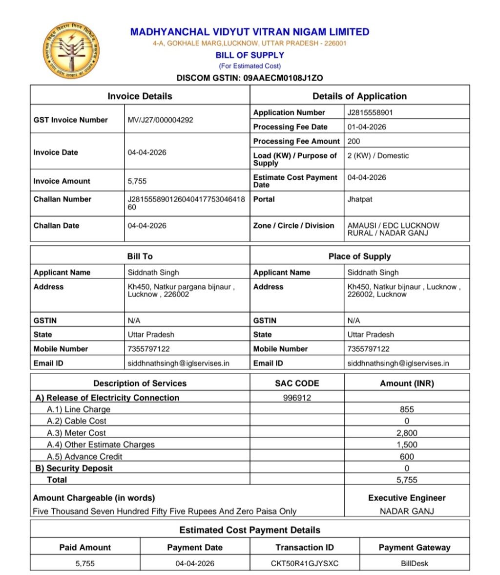 लखनऊ। मध्यांचल विद्युत वितरण निगम अमौसी ज़ोन में व्यावसायिक प्लाटिंग क्षेत्र में साधारण विद्युत संयोजन देने का मामला उजागर हुआ है जहां एक ओर उपभोक्ताओं को झटपट योजना के अंतर्गत विद्युत संयोजन लेने के लिए महीनों विभाग के चक्कर लगाने पड़ रहे हैं वहीं जोन अवर अभियंता मुकेश व्यावसायिक प्लाटिंग क्षेत्र में साधारण विद्युत संयोजन जारी कर विभाग का नाम दिनों दिन रौशन करने में जुटे है उपभोक्ता सिद्धनाथ सिंह द्वारा बीते 1 अप्रैल 2026 को आवेदन संख्या J2815558901 दिया गया जिस पर अवर अभियंता ने तत्परता दिखाते हुए 4 अप्रैल 2026 को व्यावसायिक प्लाटिंग में साधारण विद्युत संयोजन दे दिया अब प्रश्न उठता है कि जहां एक उपभोक्ताओं को विद्युत संयोजन लेने के लिए महीनों विभाग की परिक्रमा करनी पड़ती है तो कही अधिकारियों की कारगुज़ारी से घंटों का काम मिनटों में हो जाता है उपभोक्ताओं के साथ अमौसी ज़ोन में ये अधिकारियों का भेदभाव भरा रवैया विभाग की कार्यशैली पर सवालिया खड़ा करता नजर आ रहा है अब देखना होगा मामले में जिम्मेदार अपनी जिम्मेदारी कितनी निष्ठा और ईमानदारी से निभाते है ।