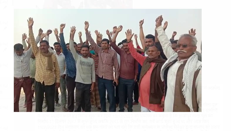 आजमगढ़ जनपद के सगड़ी तहसील क्षेत्र के उत्तरी छोर में बहने वाली घाघरा नदी पर निर्माणाधीन हाजीपुर गोला पुल से जब कार्यदाई संस्थाएं सामान समेटने लगी है तो आज फिर तीसरी बार ग्रामीणों में आक्रोश भड़क गया और ग्रामीणों ने धरना प्रदर्शन करते हुए विरोध शुरू कर दिया 19//2/2023 को ग्रामीणों का कहना है कि हाजीपुर गोला पुल का निर्माण 17 दिसंबर 2017 में शुरू हुआ जबकि 2013 से पुल निर्माण का सर्वे कार्य शुरू हुआ था और आज फिर 19/2/2023 दिन मंगलवार को जब हम लोगों को पता लगे कि एसी कनेक्शन के प्रोजेक्ट मैनेजर द्वारा सामान को उतार कर ले जाने की तैयारियां चल रही है और उतारा जा रहा है तो हम सभी ग्रामवासी दर्जनों दर्जनों की संख्या में मौके पर पहुंचे और सामान उतरवाने से रोका गया विरोध शुरू हुआ ग्रामीणों में और कारदायी संस्थाओं के कर्मचारियों के बीच कार्यदाई संस्थाओं का कहना है कि हम लोगों को पैसा नहीं मिल रहा है हम लोगों के लेबर मजदूर बैठे हुए हैं इनको तनख्वाह देनी पड़ रही है इसी कारण हम लोग सामान दूसरी जगह ले जा रहे हैं ब्रिज कारपोरेशन को सूचना भी दे रहे हैं इसके बाद भी पैसा नहीं मिल रहा है हमें ब्रिज कॉरपोरेशन से सामान लेना है और काम करना है बृज कारपोरेशन ने पैसा भी नहीं दिया और सामान भी उपलब्ध नहीं करा रही है और अगले 8 मार्च से हम खाली बैठे हुए हैं छह से सात करोड़ हमारा खर्च हो गया है वहीं धरना प्रदर्शन करने वालों में रामनिवास यादव जगदीश यादव रामनाथ यादव रामकरण राधेश्याम रामजीत पटेल प्रमोद कुमार श्रीराम साहनी मिलेवा देवी मीरा उर्मिला मुराही अनुसुइया सहित काफी संख्या में ग्रामीण मौजूद रहे।